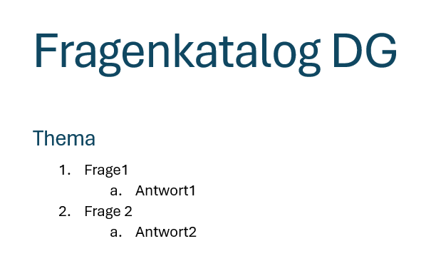 Beim ersten Theoriethema gemeinsam ein Worddokument âFragenkatalogâ beginnen, in dem die SuS Fragen und Antworten notieren, um eine Sammlung fĂŒr einen möglichen Test aufzubauen.
