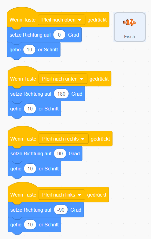 - Beispiel: Wenn Taste “Pfeil rechts” gedrückt wird, dann bewegt sich die Figur 10 Schritte vorwärts.